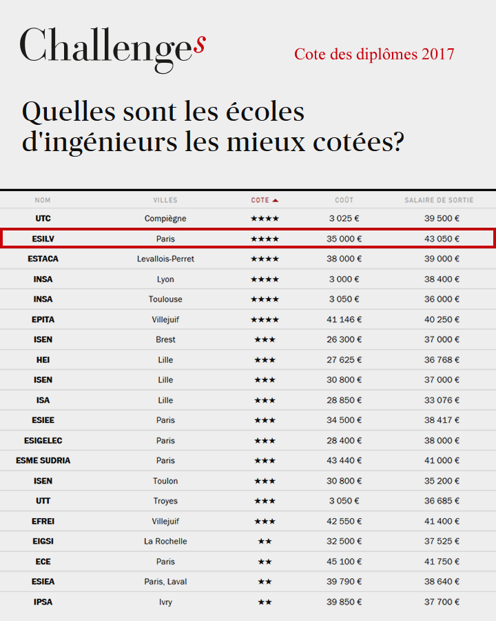 Toutes filières confondues (post-bac et post-prépa), 15 écoles d’ingénieurs dont 6 post-bac obtiennent 4 étoiles dans le palmarès de la cote des diplômes 2017 établie par la magazine Challenges, dont l’ESILV.