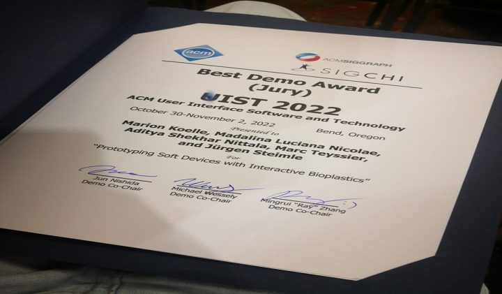 Co-signé par Madalina Nicolae, doctorante en Human Computer Interaction, Marc Teyssier, Principal Investigator du groupe Resilent Futures au De Vinci Innovation Center, et deux autres chercheurs de l’Université Saarland, son article intitulé « Prototyping Soft Devices with Interactive Bioplastics » a reçu le Best Paper Award à la conférence UIST 2022.
