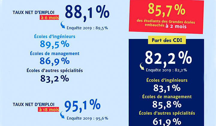 Sur les élèves de la promotion 2019, 88,1% des diplômés des grandes écoles ont obtenu un emploi 6 mois après l’obtention de leur diplôme. Plus de 85% des jeunes diplômés sont embauchés dans les 2 mois suivant la fin des études et plus de 80% des embauches sont des CDI dès leur sortie de l’école. Plus de 80% des diplômés des grandes écoles se déclarent très « satisfaits » ou « satisfaits » de leur emploi, en tenant compte des critères suivants : conditions de travail, relations avec les collègues, niveau de rémunération, d’autonomie et de responsabilité, situation géographique.