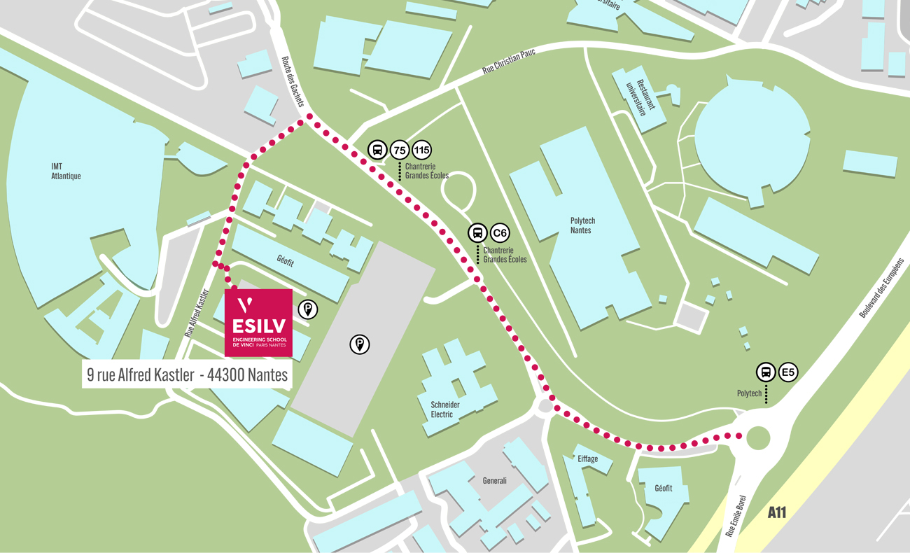 Au rond point, prendre la sortie sur Route de Gachet puis prendre à gauche sur Rue Alfred Kastler. Places de parking à proximité du campus.