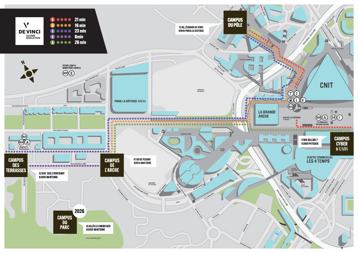 A Paris-La Défense, le Pôle Léonard de Vinci dont fait partie l’ESILV dispose d’un campus multi-sites. Installations et équipements de pointe permettent aux élèves d’étudier et de se former dans d’excellentes conditions.