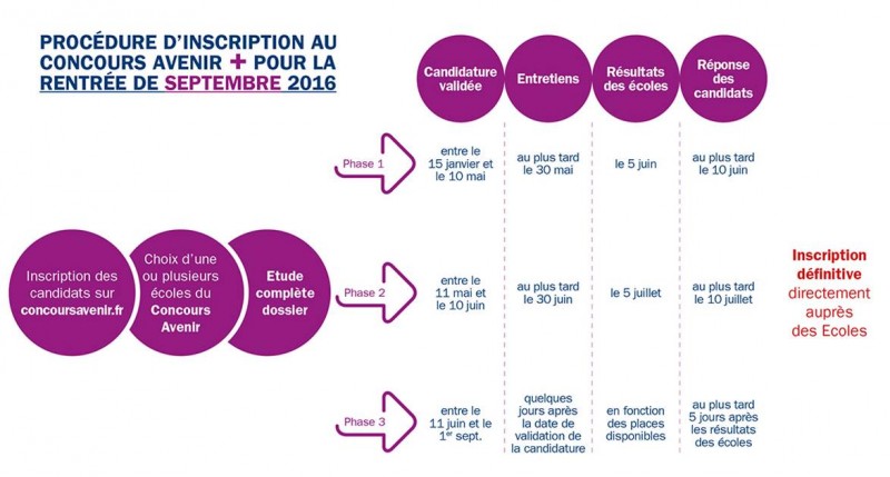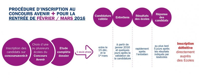 Afin de répondre à la complexité et à la multitude des processus d’inscriptions pour les étudiants déjà détenteurs du bac, le Concours Avenir crée le Concours Avenir +. Ce dernier permet aux élèves déjà en études supérieures de rejoindre l’une des écoles du Concours Avenir en 1ère, 2ème, 3ème ou 4ème année en fonction de leurs études actuelles.
