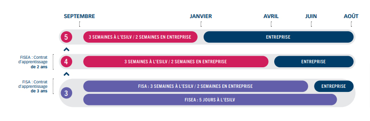 Rythme : 3 semaines école / 2 semaine entreprise + Temps plein en entreprise (à l’exception d’une rentrée en 4e année FISA à Paris en 2025, rythme 3j/2j)