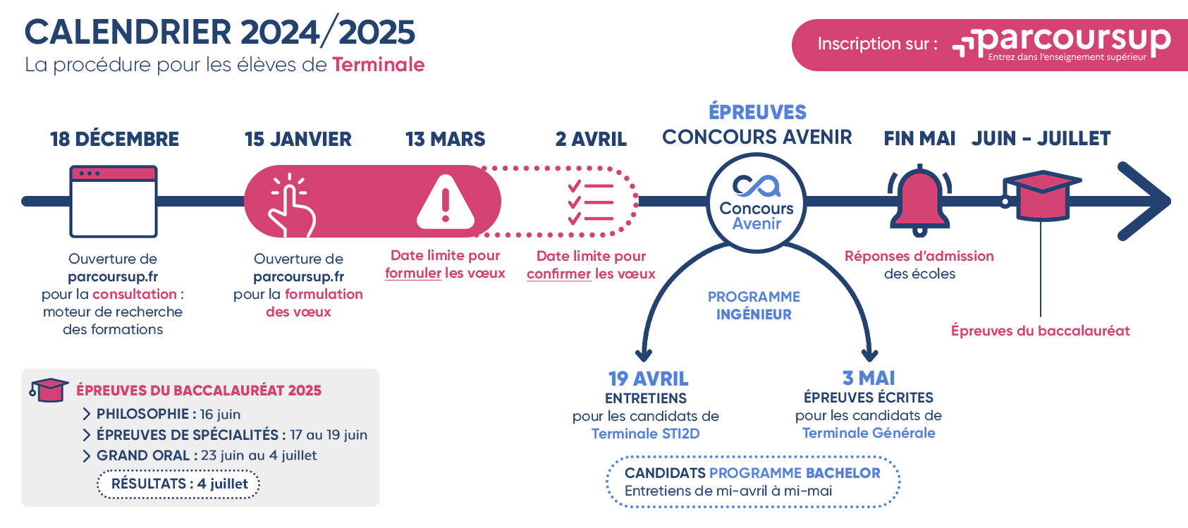 Le portail Parcoursup ouvre ses portes le 17 décembre 2025, date à partir de laquelle les lycéens de terminale peuvent consulter les fiches des formations. Ils peuvent ensuite s’inscrire et saisir leurs vœux du 19 janvier 2026 jusqu’au 12 mars 2026. Le concours AVENIR BAC compte pour 1 des 10 vœux possibles.