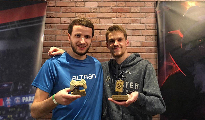 A gauche sur la photo, c’est Pierrick, ingénieur chez Altran, qui a remporté la compétition sur FIFA 2019.