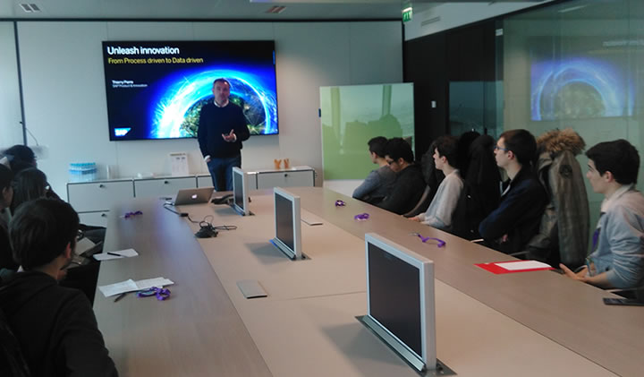 Les élèves-ingénieurs ont assisté à une conférence sur le Big Data et les Objets Connectés donnée par Thierry Pierre, expert SAP, du service Product Innovation Analytics. Ils ont pu appréhender l’étendue de l’influence de SAP dans le monde et le nombre de sociétés utilisant leurs solutions (Total, Air France…).