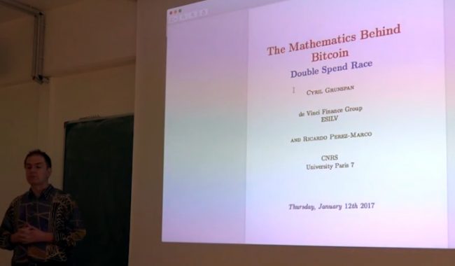 Cyril Grunspan considère ensuite la partie mathématique de Bitcoin, en pointe les faiblesses et étudie la possibilité de réaliser des paiements rapides sans attente de confirmations sur la blockchain. La partie mathématique du papier fondateur de Satoshi Nakamoto souffre cependant d’une approximation. La probabilité de réussite d’une double-dépense est estimée en remplaçant grossièrement une loi binomiale négative par une loi de Poisson comme expliqué par Meni Rosenfel dès 2012.