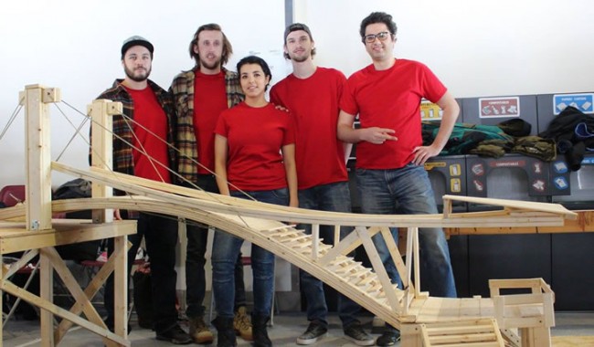 Cette année, le défi consistait à construire un modèle réduit à l’échelle 1 : 10, d’un passage piéton reliant deux plateformes à des niveaux distincts. La conception de la structure en bois devait faire preuve d’un design novateur et optimisé structuralement.