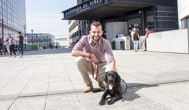 They never part. David Dupuis, ESILV Class of 2016 and PhD student at De Vinci Research Center in partnership with Kwanko, welcomed a young labrador meant to become guide dog for the visually impaired. During a year, he will raise him and must have him by his side at all times, including at work, at ESILV.
