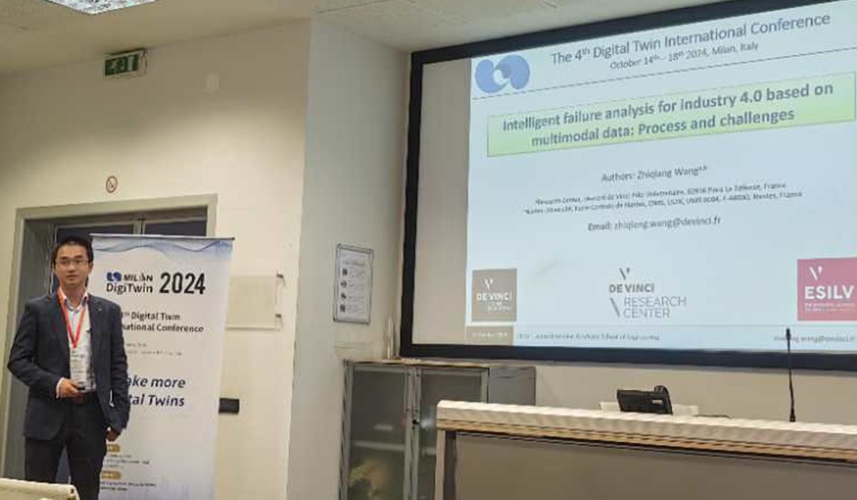 In a representation of ESILV’s pioneering approach to Industry 4.0 and intelligent data analysis, Professor Researcher Zhiqiang Wang recently presented his research at the 4th International DigiTwin Conference in Milan. His presentation, titled “Intelligent Failure Analysis for Industry 4.0 Based on Multimodal Data: Progress and Challenges”, delved into the latest advancements and hurdles in using multimodal data for intelligent failure analysis—an area crucial to the success and efficiency of Industry 4.0 operations.