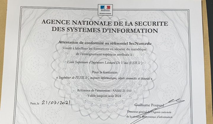 SecNumedu is a certification process for higher education courses in cyber security. This label from ANSSI distinguishes courses that meet a set of specifications in terms of quality, expertise and level of teaching. ESILV’s “Computer Science, Connected Objects and Security” major was recently awarded the SecNumedu label. It means that it is part of a network of universities renowned in the cybersecurity sector.