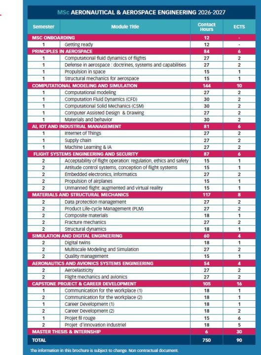 MSc Aeronautical & Aerospatial Engineering accredited by CGE – Conférence des Grandes Ecoles • 18 month programme • 90 ECTS • 2026-2027 Tuition fee 12900 € • Intake: January 2026