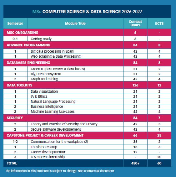 MSc Computer Science & Data Science accredited by CGE – Conférence des Grandes Ecoles • RNCP accredited • 12 month programme • 60 ECTS • 2026-2027 tuition fee 13400€ • Intake: October • Application Deadline: June 2026