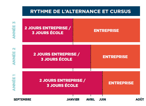 Rythme : 3 semaines école / 2 semaines entreprise + périodes de temps plein en entreprise