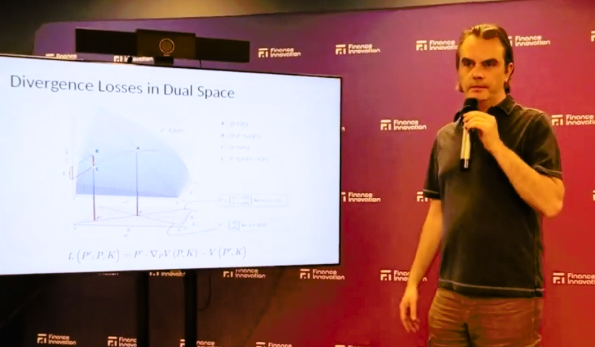 La deuxième conférence a été donnée par Julien Prat, chercheur affilié au CNRS, au CREST et à l’École polytechnique (IP Paris). Son exposé portait sur « L’économie des teneurs de marché à fonction constante ». Il a expliqué comment la théorie microéconomique peut être appliquée pour comprendre le fonctionnement interne des teneurs de marché à fonction constante (CMFC). Cette approche offre des outils puissants pour caractériser la conception optimale des Constant Function Market Maker (CFMM).