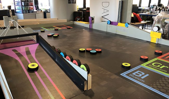 Le tapis de jeu est adhésif. De l’autre côté, il est antidérapant, pour éviter que les robots ne fassent de tonneau !