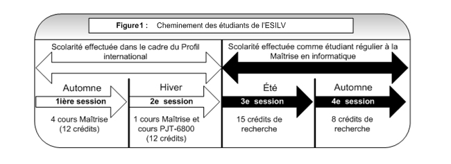 Cette durée inclut les 2 premières sessions effectuées dans le cadre du Profil international (cf. figure 1). Le séjour commence à la session d’automne soit au début du mois de septembre et se termine à la fin du mois de décembre de l’année suivante sous réserve de la recommandation par le directeur de recherche et l’autorisation par le directeur du programme du dépôt du mémoire témoignant de la consistance du travail de recherche réalisé au terme de ce séjour.