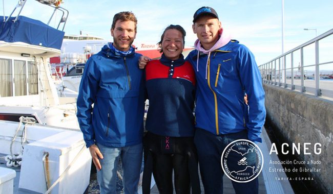 L’équipe des trois nageurs en affrontant les vagues du Gibraltar