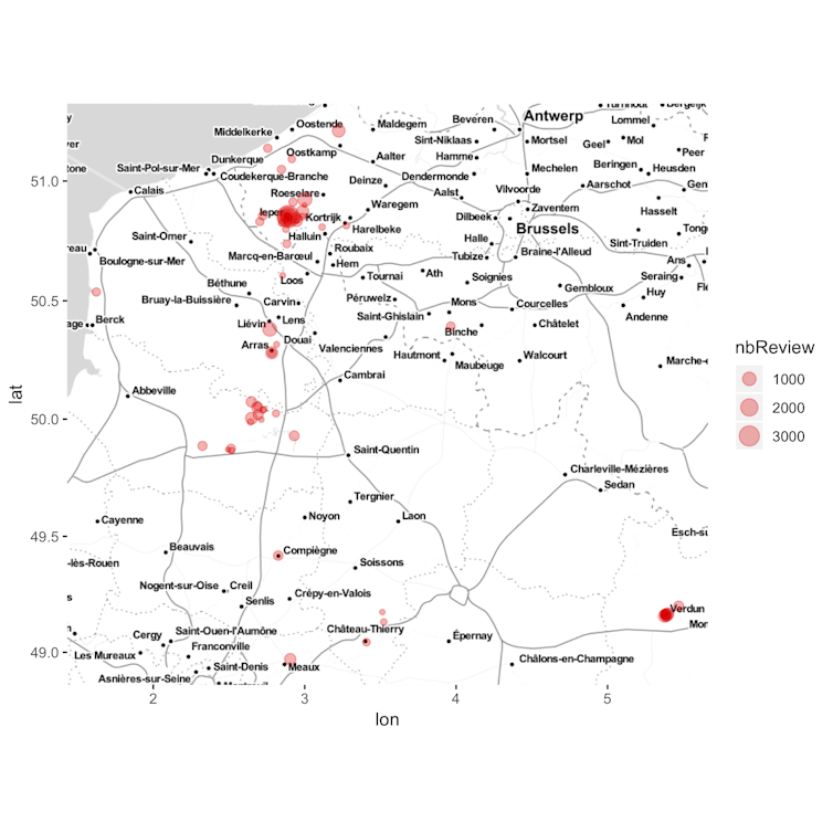 La carte 1 montre la géographie de ces lieux mémoriels du Front Ouest, de la Belgique à la Meuse, leur concentration et leur hiérarchie du point de vue du nombre de commentaires sur le site TripAdvisor. Les sites et visites en Belgique regroupent plus de 16 500 commentaires, contre moins de 12 000 côté français (de la Meuse au Nord). En effet, les trois sites qui reçoivent le plus de commentaires sont localisés à Ypres, qui apparaît dès lors comme le centre de cette destination mémorielle : il s’agit du musée de la guerre in Flanders Field, du mémorial de la Porte de Ménin, et de la cérémonie Last Post de la Porte de Ménin, hommage aux clairons aux soldats du Commonwealth morts durant la Première Guerre mondiale qui a lieu tous les soirs à 20 heures. Côté français, les sites de mémoire qui reçoivent le plus de commentaires sont le mémorial de Vimy et le Fort de Douaumont. TripAdvisor fait ainsi apparaître la carte du tourisme de mémoire en mettant en évidence plusieurs sites, autour de Verdun et des Hauts-de-France, à la fois le long du Front (notamment dans la Somme) et plus en retrait (clairière de l’Armistice).