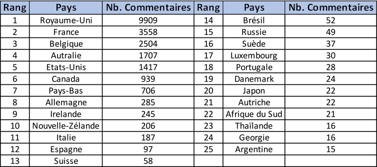 Des analyses détaillées par sites montrent une propension plus forte à commenter les sites mémoriels renvoyant à son pays d’origine. Par exemple, 73 % et 81 % des contributeurs du Musée franco-australien et de l’Australian War Memorial déclarant leur origine sont Australiens. Cela ne signifie pas qu’ils ne visitent pas d’autres sites : la présence des commentaires pointe simplement les sites qui font sens pour les visiteurs.