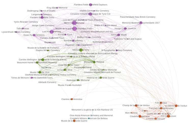 En raison de leur taille (nombre absolu de commentaires) et de l’importance de leurs arêtes, certains sites apparaissent comme nœuds de cet espace mémoriel, passages obligés des parcours mémoriels. Si les relations entre sites permettent de distinguer comme sous-ensembles la zone en Belgique, la zone du nord de la France et la zone de Verdun, des arêtes connectent les sites de ces trois zones entre elles, indiquant des contributeurs en commun, et donc des circulations mémorielles entre la Belgique, le nord de la France et Verdun. Ces circulations font exister ce vaste territoire international comme destination mémorielle.