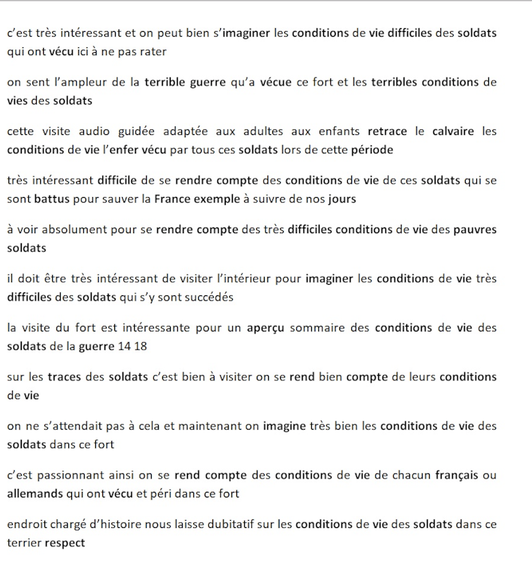 Enfin, l’extraction des commentaires triés par langues puis leur analyse lexicale (via le logiciel Iramuteq), permet de dégager les modalités du rapport des touristes aux sites mémoriels. Loin de ne commenter que l’accès, la qualité de l’accueil, le prix des billets, une grande partie des commentaires sur les sites mémoriels (champs de bataille, mémoriaux, musées) évoquent l’impression faite par le site et suscite des réflexions sur la guerre et le sacrifice des soldats.
