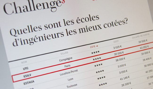Toutes filières confondues (post-bac et post-prépa), 15 écoles d’ingénieurs dont 6 post-bac obtiennent 4 étoiles dans le palmarès de la cote des diplômes 2017 établie par la magazine Challenges, dont l’ESILV.