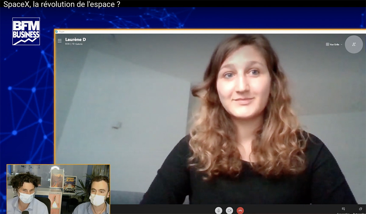 Le 22 avril dernier, Laurène Delsupexhe, diplômée de la filière aéronautique de l’ESILV, majeure Modélisation et mécanique numérique, a participé à l’émission « SpaceX, la révolution de l’espace » sur BFM Business. Ce live stream présenté par Thomas Leroy, journaliste et Jean-Baptiste Huet, reporter chez BFM Business, fait partie de tous premiers contenus proposés par la chaîne économique sur Twitch, plateforme de streaming en direct.