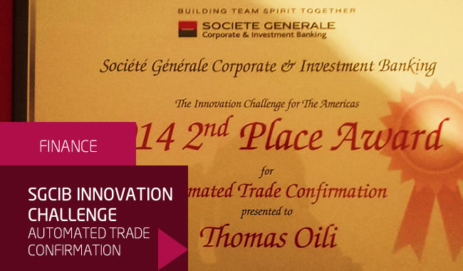 Organisé tous les ans par Direction des Systèmes d’Information de Société Générale Corporate & Investment Banking, le challenge d’innovation est un concours organisé sur chaque continent visant à promouvoir un projet d’équipe en rapport avec les systèmes d’information de la banque qui permettrait d’optimiser des processus. Les candidats doivent soutenir leurs projets devant des jurys durant plusieurs rounds éliminatoires jusqu’à ce qu’il ne reste plus que 5 équipes finalistes qui reçoivent toutes un prix.