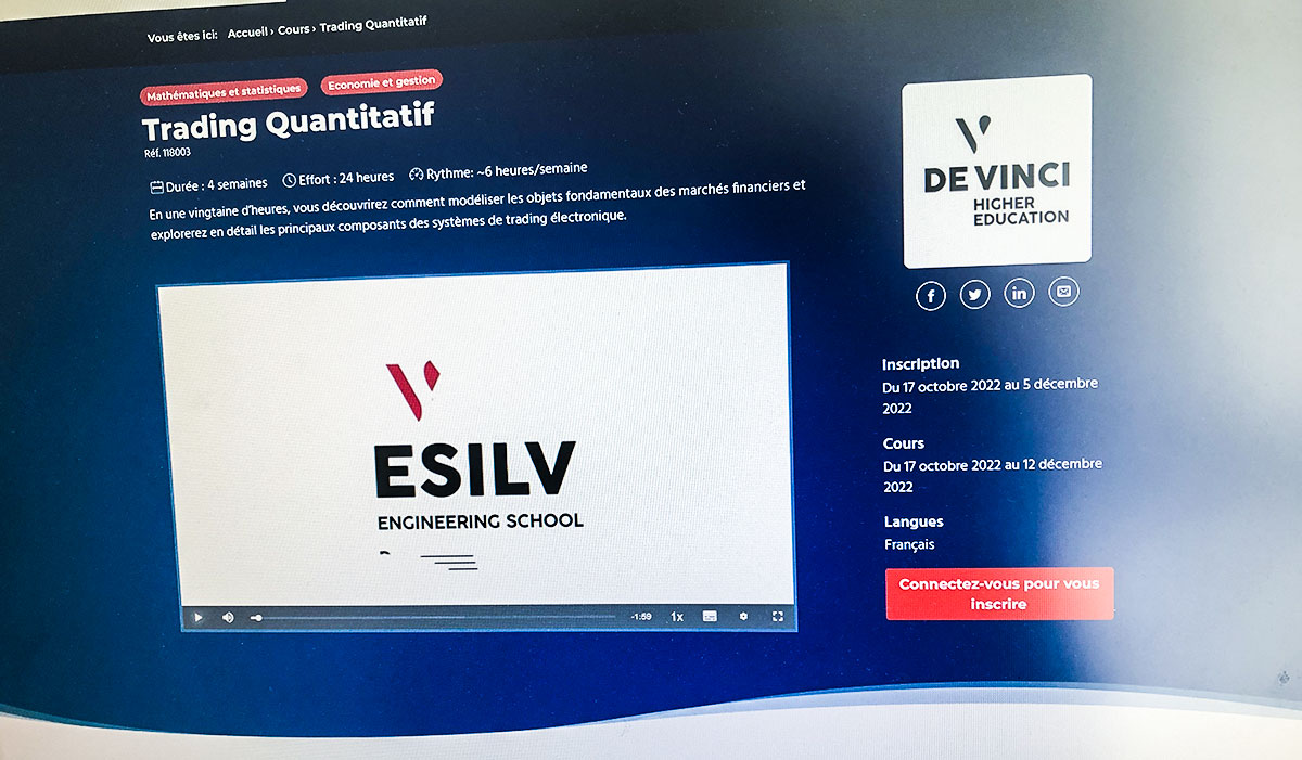 Le MOOC « Trading Quantitatif » est conçu par Jérôme Busca, enseignant-chercheur à l’ESILV, expert des questions financières. Le cours cible les étudiants en école d’ingénieurs ou ceux de master en sciences ainsi que les professionnels souhaitant se reconvertir dans les métiers du front office. Il est disponible depuis le 17 octobre sur la plateforme FUN MOOC, proposée par France Université Numérique.