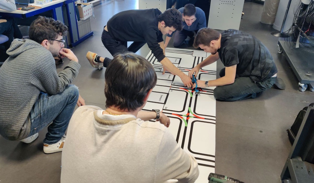« Nous avions une maquette d’un aéroport (à peu près 2 mètres par 2,5 mètres) et nous avons dû concevoir un robot capable de se balader sur la maquette et de déplacer des avions miniatures d’un point A à un point B afin de les garer », raconte Mathis, promo 2024.