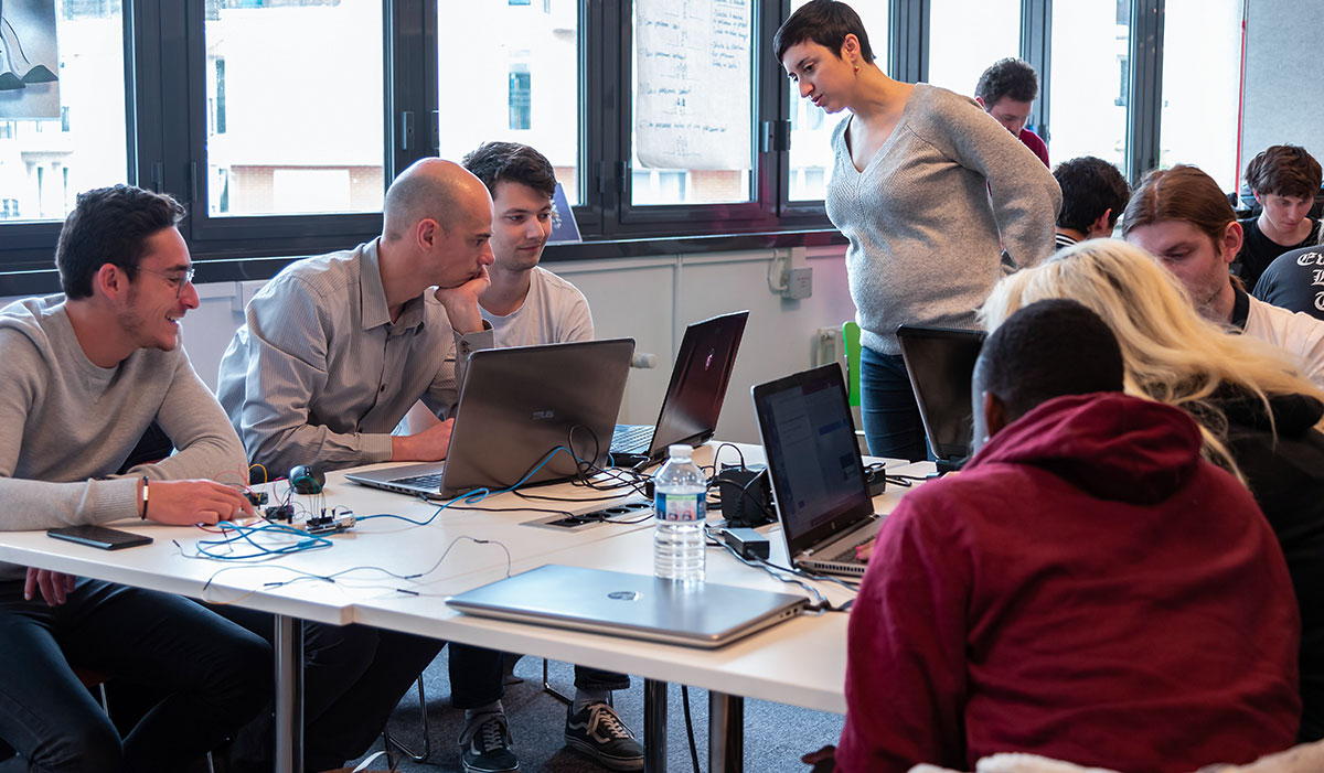 En plus des projets et des cours, il y a des hackathons qui sont mis en place régulièrement. Il s’agit d’ateliers d’un jour, trois jours, voire une semaine de travail très intense en groupe où il y a une problématique au départ et l’idée est de répondre à cette problématique en travaillant tous ensemble.